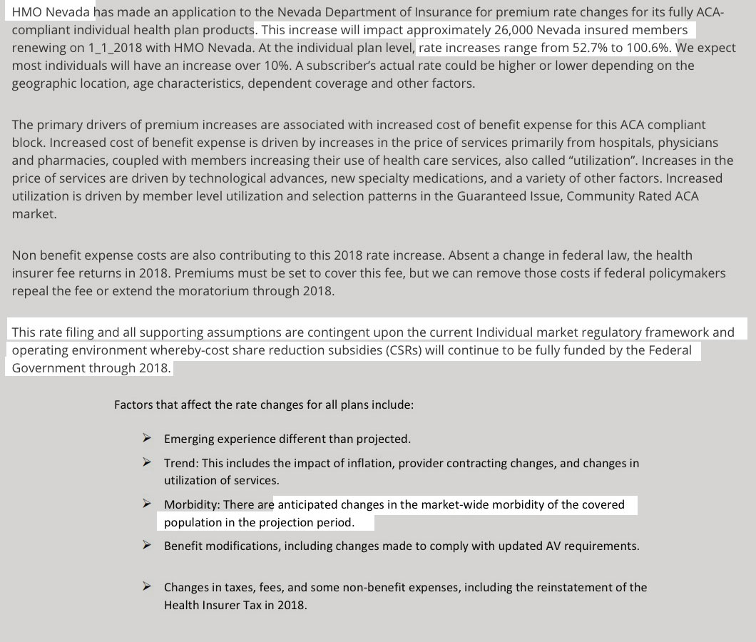 Four of the six individual market carriers are off-exchange only, so the CSR reimbursement issue is a non-factor for them. That leaves two carriers (Health Plan of NV and HMO Nevada), both of which seem to be operating on the assumption that CSRs will continue to be paid. This means that the 28.9% and 60.3% average rate hikes being requested by each would be around 10 points higher if CSRs aren't paid next year (spread across all metal levels), for an ugly statewide rate increase of either 37.8% with CSRs or 44.4% without them.