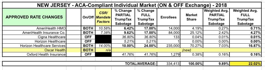 Still, sabotage is sabotage. As for the other three off-exchange-only carriers (Cigna, Oxford and another division of Horizon), they only have about 1,300 enrollees between them, so even though I don't know what their approved rate increases are, it wouldn't be more than a rounding error no matter how high or low it is.
