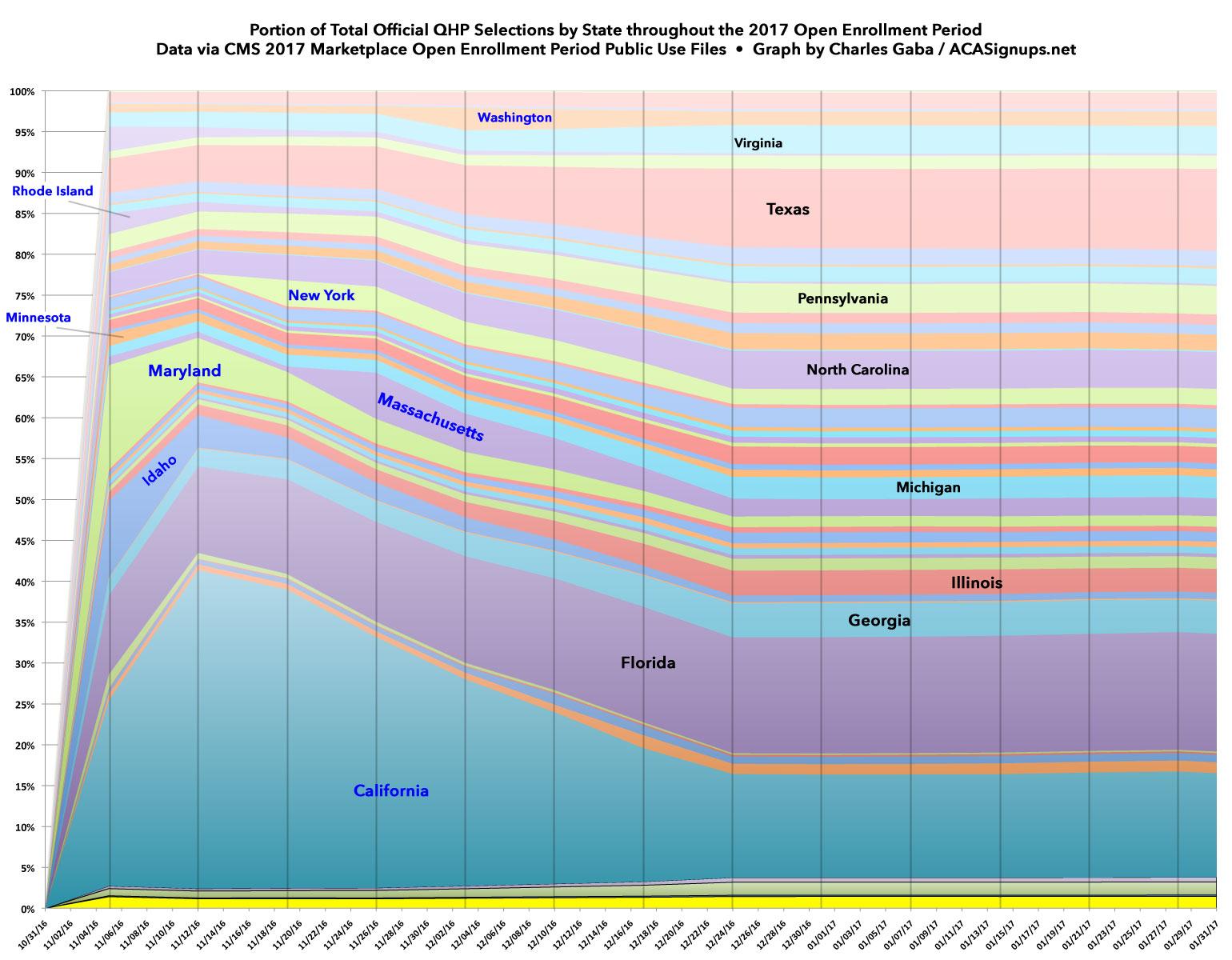 Since all 39 are administered, entered into the system and reported the same way, the only variances between them are their relative population size: Large states are thicker, small states are thinner throughout the entire enrollment period as you'd expect.