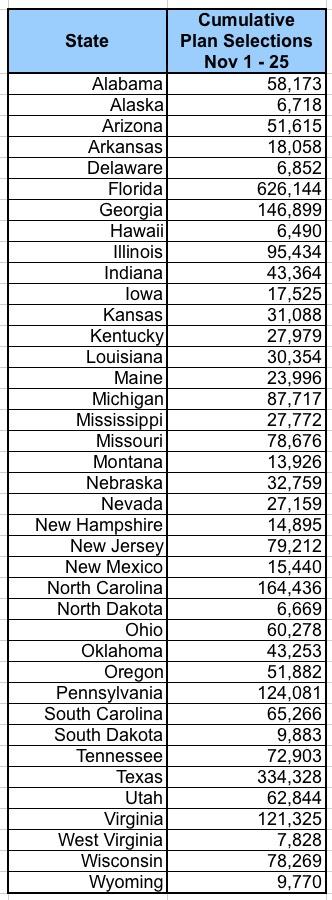 Overall, enrollments are up 30% year over year so far...although again, you'd have to tack on a small number of enrollments for 11/26 to get an exact match (it wasn't just a Sunday, but Sunday on a holiday weekend, so it was likely a pretty nominal number...probably no more than 25,000 or so at most, I'd imagine, bringing the grand total up to around 2.8 million even, or around 31% higher). This is down from around 38% higher last week, which was down from being 47% higher through week 2 and 45% higher in week 1. This, again, is pretty much in line with my expectations: There was no way that enrollment was gonna continue to run nearly 50% ahead of last year, even given the shortened timeframe.