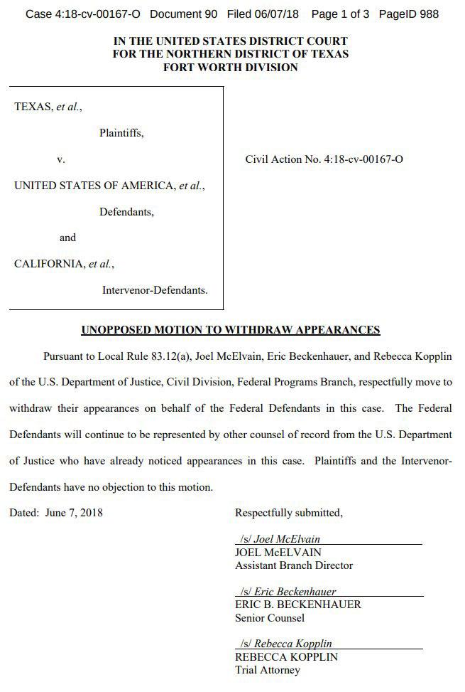 Guys, I have a very bad feeling about this. These are the civil servant line attorneys withdrawing from the Texas lawsuit minutes before the USG's brief is due to be filed.
