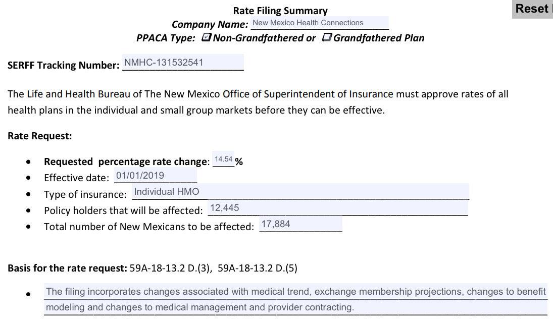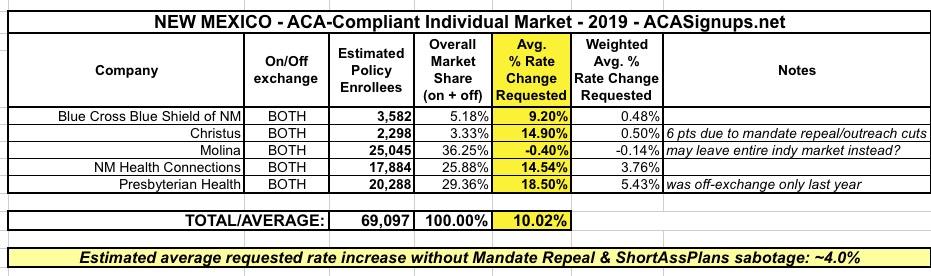 New Mexico: Preliminary 2019 ACA rate hike request:10%; est. ~6% due specifically to ACA sabotage