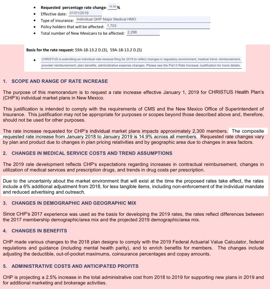 - Christus: 14.9 percent (2,298 members). Of that rate increase, 6 percentage points are due to “less tangible items, including non-enforcement of the individual mandate and reduced advertising and outreach.” In other words, the rate increase proposal would be single-digit if the individual mandate penalty weren’t going away, and if the Trump Administration hadn’t sharply reduced funding for exchange outreach and marketing.