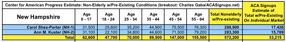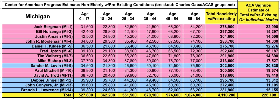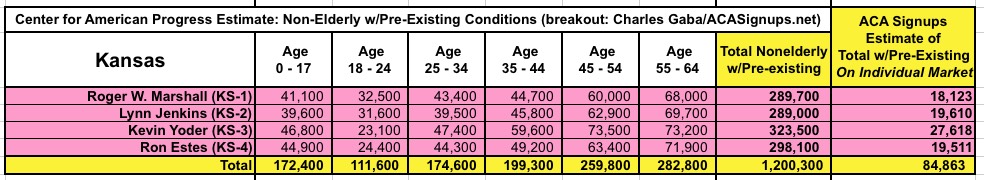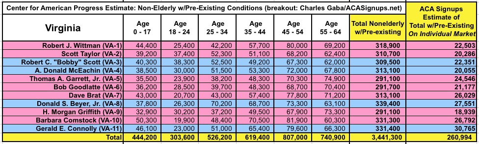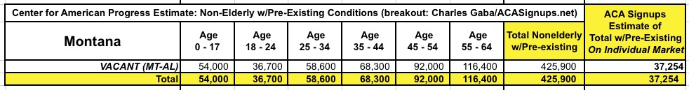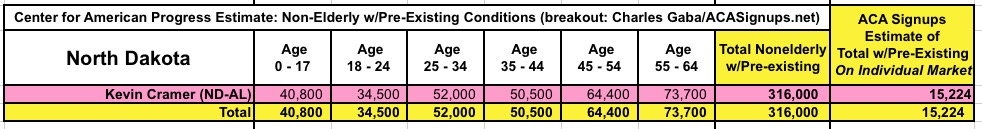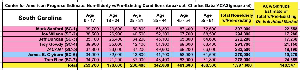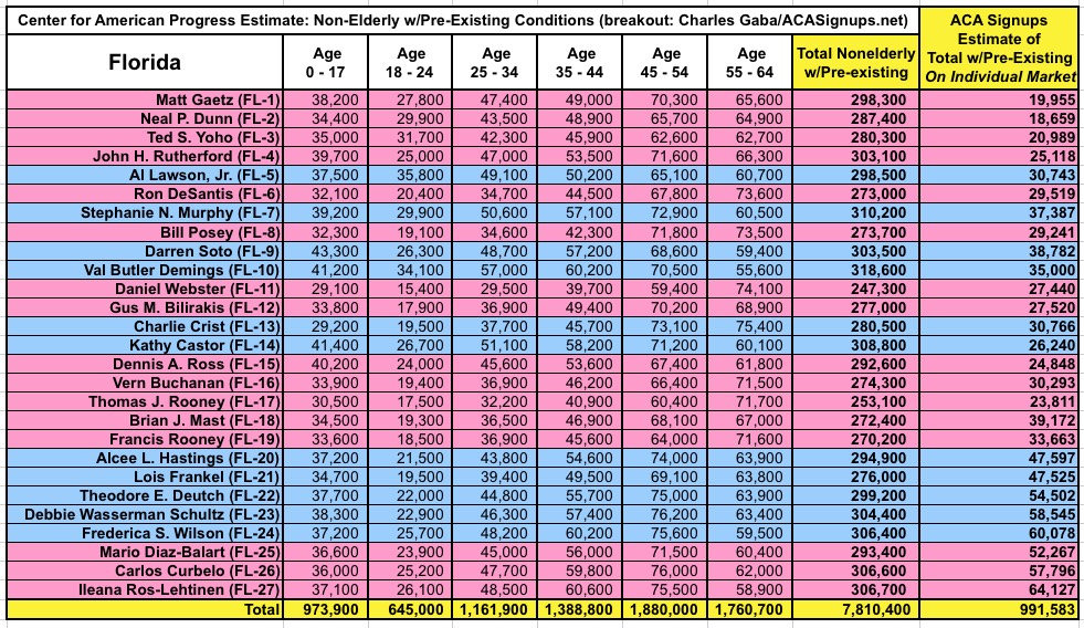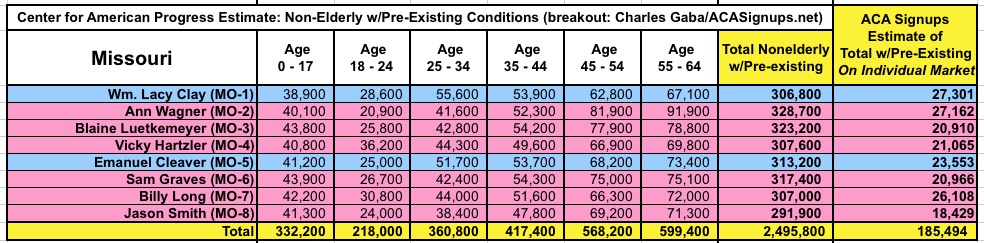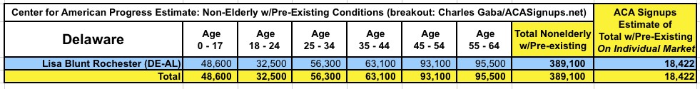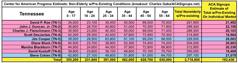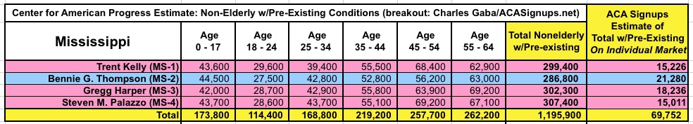 The CAP spreadsheet is extremely handy, and they deserve full credit for crunching the numbers. Unfortunately, it's only available as a single massive spreadsheet, so I've takent the liberty of grouping all 435 CDs together by state into shareable JPG images. I'm also color-coding each CD by party control and, while I'm at it, I'm also plugging in my own estimate of how many people currently on the individual market likely have some sort of pre-existing condition which would likely result in them being charged dramatically higher rates to the point that they likely couldn't afford coverage whatsoever if the Trumpcare 2.0 bill were passed. These estimates are obviously much lower than the total nonelderly population, and are based on: