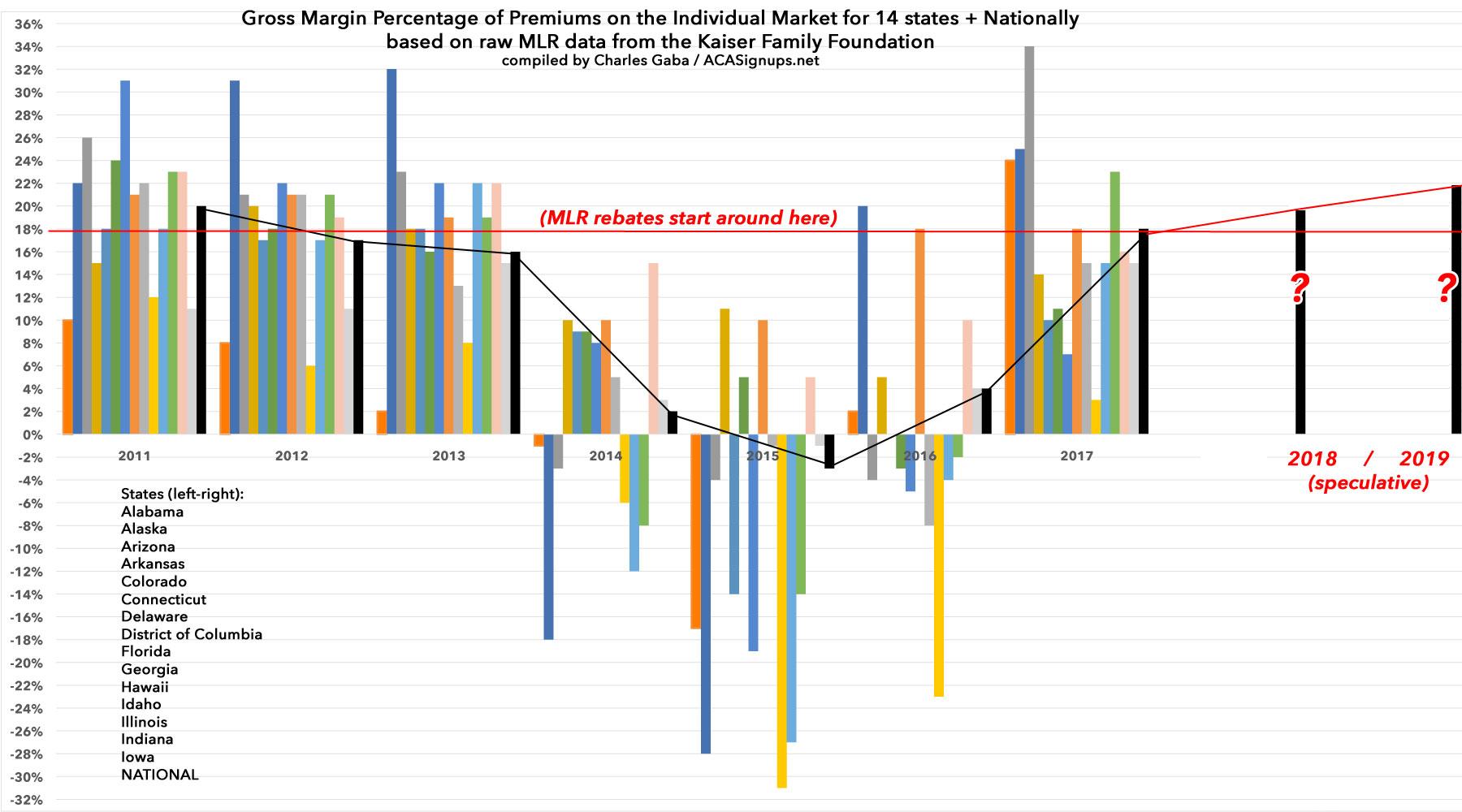 2017 pricing...which was actually locked in just before the 2016 election...was where the rest of the band-aid was ripped off: Average premiums were raised around 20-25%. As a result, while some states were still coming in low (or high, depending on your POV), for the most part they were right back up to where they should have been: Around an 82% raw MLR, or 18% gross margins, just like before 2014.
