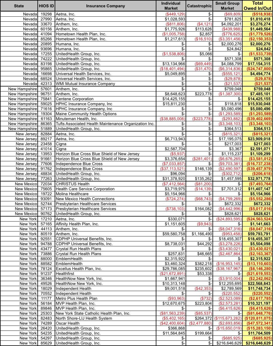 So, about an hour ago, CMS released the actual 2017 RA report itself, which lists (among other interesting info), exactly how much money insurance carriers in every state owe or are owed from last year. There are three categories: The Individual Market (Bronze, Silver, Gold & Platinum); the Catastrophic Individual Market; and the Small Group Market. the total amount of money involved is around $10.4 billion ($5.2 billion owed by carriers, $5.2 billion owd to carriers).