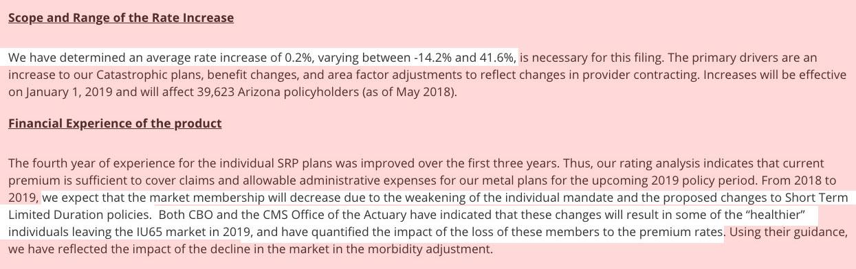 Arizona has only three carriers offering individual market policies next year. Blue Cross Blue Shield of AZ has nearly 40,000 enrollees and is keeping rates virtually flat, but specifically states that yes, they baked in extra costs to account for Congressional Republicans repealing the ACA's Individual Mandate and due to Trump's expansion of #ShortAssPlans (see screenshot below).