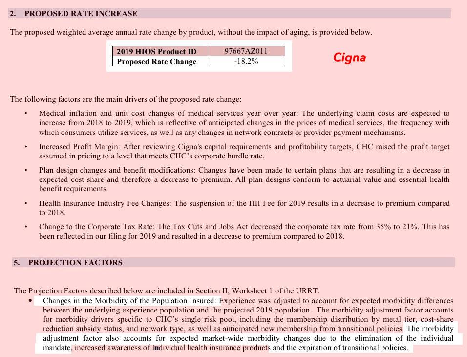 Finally, Cigna is dropping their 2019 premiums by a whopping 18.2% even with sabotage factors, which again are referenced in the filing. I don't know their enrollment either, but amd assuming it's roughly 16,000 since Arizona's total ACA indy market is around 150,000 people.