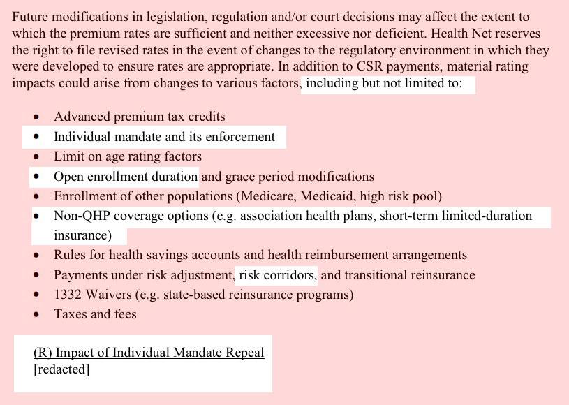 Centene is dropping rates by over 5 points. I don't know their exact enrollment/market share, so I'm forced to assume it's similar to last year's 95,000. Again, they call out both #MandateRepeal and #ShortAssPlans, but don't include a specific percentage for either (they did, but it was redacted in the public filing).