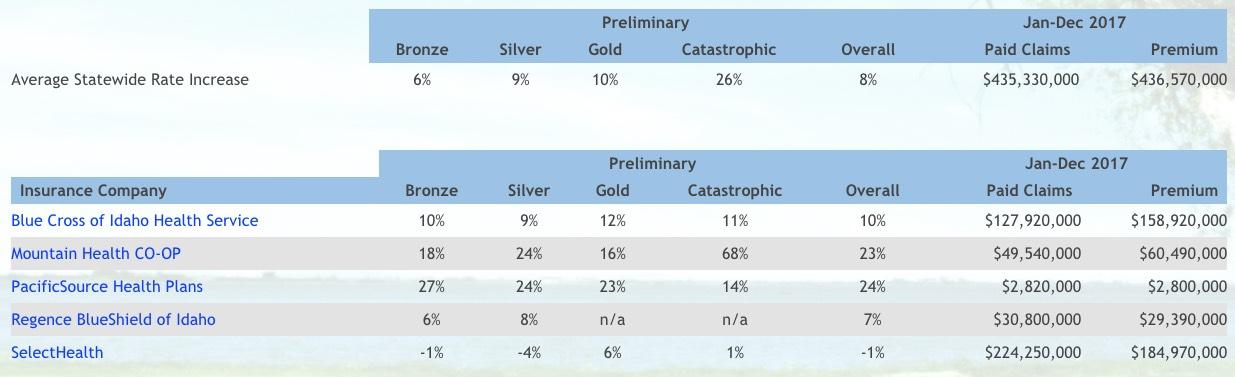 Idaho's insurance department website displays their annual rate filing summaries in a unique way--they don't publish the actual enrollment numbers, but they do post breakouts of the rate hikes for different metal levels (handy!) as well as the premiums brought in and claims paid out, which gives some refreshing insight into just how profitable (or not) some fo the carriers are (if I'm reading the screenshot correctly, it looks to me like BCBS and Mountain Health did just fine last year, but the other three carriers ended up in the hole (especially SelectHealth...ouch).