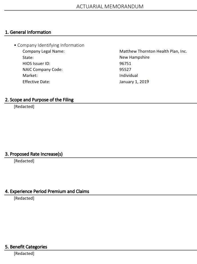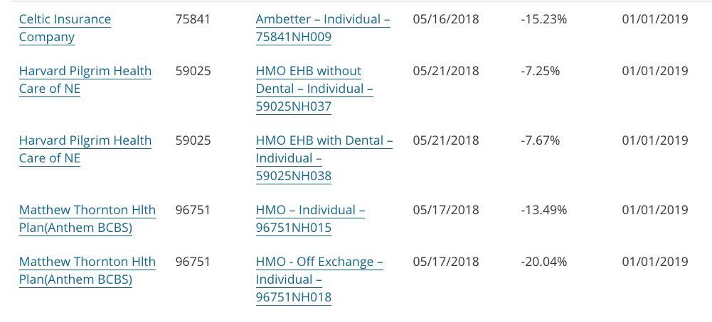The average premium decrease is an eyebrow-raising 13.5%. This is the greatest reduction in ACA premiums I've see so far this year, made all the more unusual by that fact that New Hampshire doesn't have a new reinsurance program or Medicaid expansion factor to take into account. Basically, all three carriers simply overestimated how much their costs would go up this year.