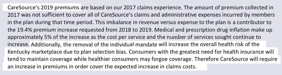 CareSource notes in their filing (see below) that 5% of their 19.4% increase is due to medical/drug inflation. For the remaining 14.4%, they state flat out that the repeal of the individual mandate is a significant factor. Asuming my rough estimate of a 12.5% sabotage impact (both mandate repeal and non-ACA compliant short-term/association plan expansion) is accurate, this means that rates would have been flat year over year otherwise.