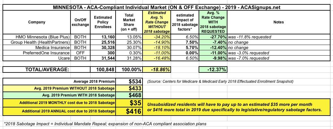 Minnesota: APPROVED 2019 #ACA rates: 12.4% lower, but would have dropped 18.9% w/out #ACASabotage