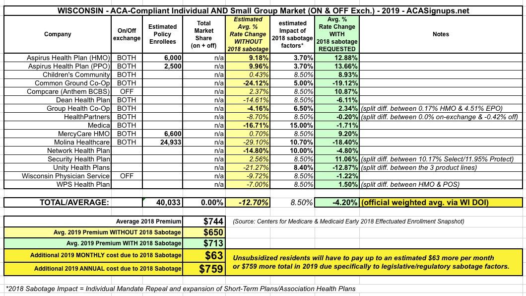 As for my estimate of the #ACASabotage impact, based on my review of the actual rate filings from the carriers, I'm now thinking 13% was overstating it for Wisconsin--of the 16 (!) different carriers participating in WI's individual market next year, 8 of them included solid, precise mandate repeal/#ShortAssPlans rate impact numbers, and they average around 8.5 percentage points.