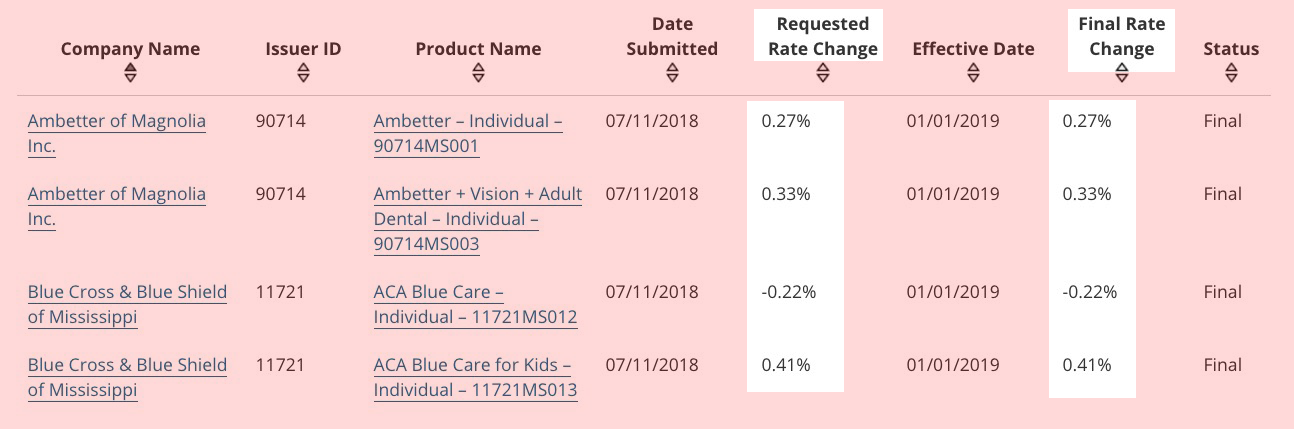 Fortunately, RateReview.HealthCare.Gov has finally updated their database to include the approved rate changes for every state, which made it easy to take care of most of these. Making things even easier (although not necessarily better from an enrollee perspective), in three states the approved rates are exactly what the requested rates were for every carrier: Alabama, Mississippi and Utah: