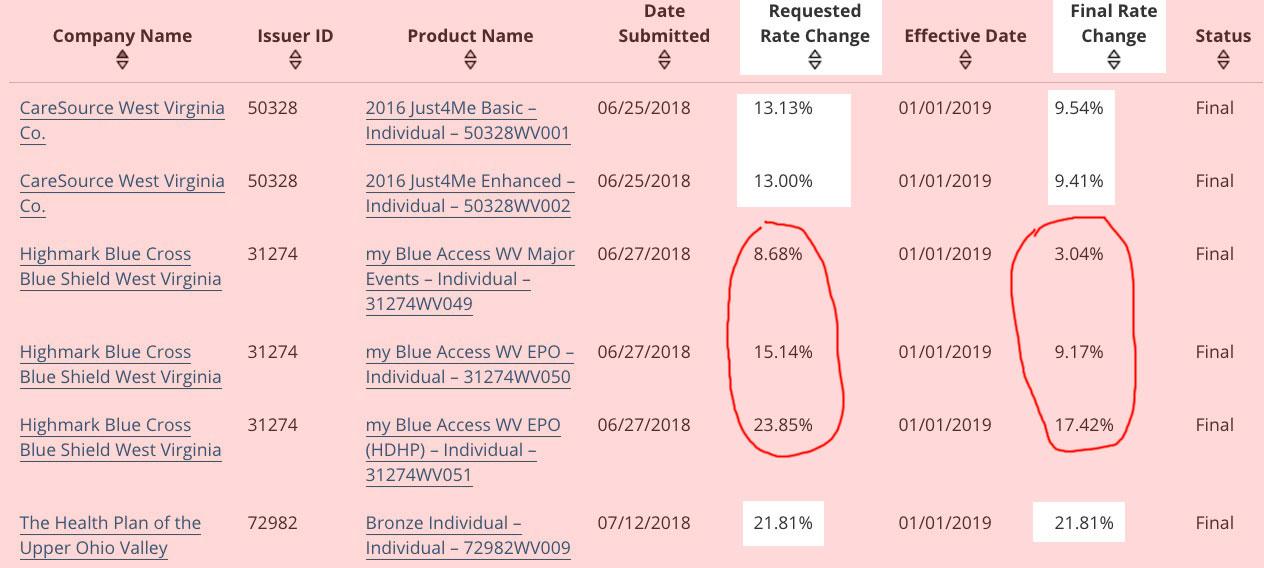 West Virginia's requested average rate increase was among the highest in the country for 2019--a weighted average of around 14.9%.