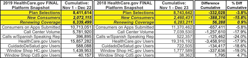 What's most noteworthy to me here, aside from the significantly lower number of people "scrubbed" from their plans after 12/15 (43,268 lower than the Week 7 report) is that the number of current enrollees renewing their coverage actually ended up increasing slightly year over year (by nearly 1%) while the number of new enrollees ended up dropping a bit more than Week 7 had already indicated (15.8% instead of the 15.4%) which it had previously looked like). Overall, instead of the grand total dropping by 4.2% year over year, it was down only 3.8%, or around 332,000 enrollees.