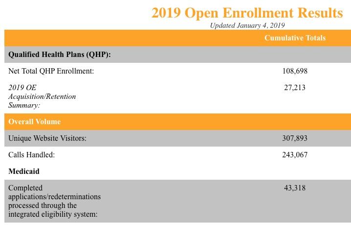 That's a net increase of 6,286 QHP selections between 12/15/18 - 1/04/19, or around 300 per day on average. At that rate, they'd add around 3,300 more by the final 1/15 deadline, putting them 112,000...still around 2,100 shy of last year. On the other hand, that timeframe included both Christmas and New Year's Eve, when enrollment tends to drop through the floor, so there's still a chance of Access Health CT at least matching 2018, though exceeding the 114,134 tally would be a pretty tall order at this point.