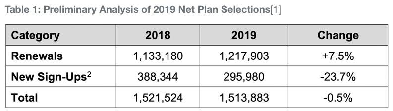 The total number of net plan selections for 2019 is 1,513,883, which reflects 1,217,903 consumers having their coverage renewed and 295,980 consumers who newly signed up for coverage during open enrollment (see Table 1: Preliminary Analysis of 2019 Net Plan Selections). Overall, there is a difference of 7,641 fewer plan selections compared to 2018, a decrease of 0.5 percent.