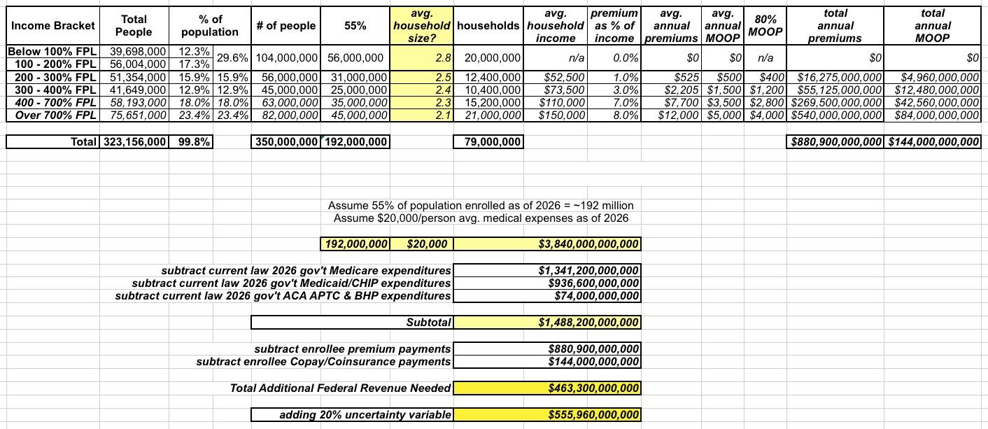 IMPORTANT: This assumes no cost savings from lower healthcare provider reimbursement rates, reduced expenses thanks to improved preventative care, reduced ER visits since no one would have to rely on the emergency room for basic services, increased efficiency and so forth.