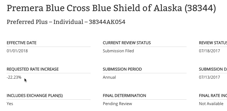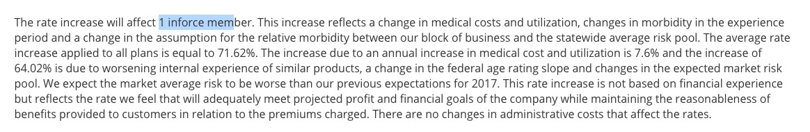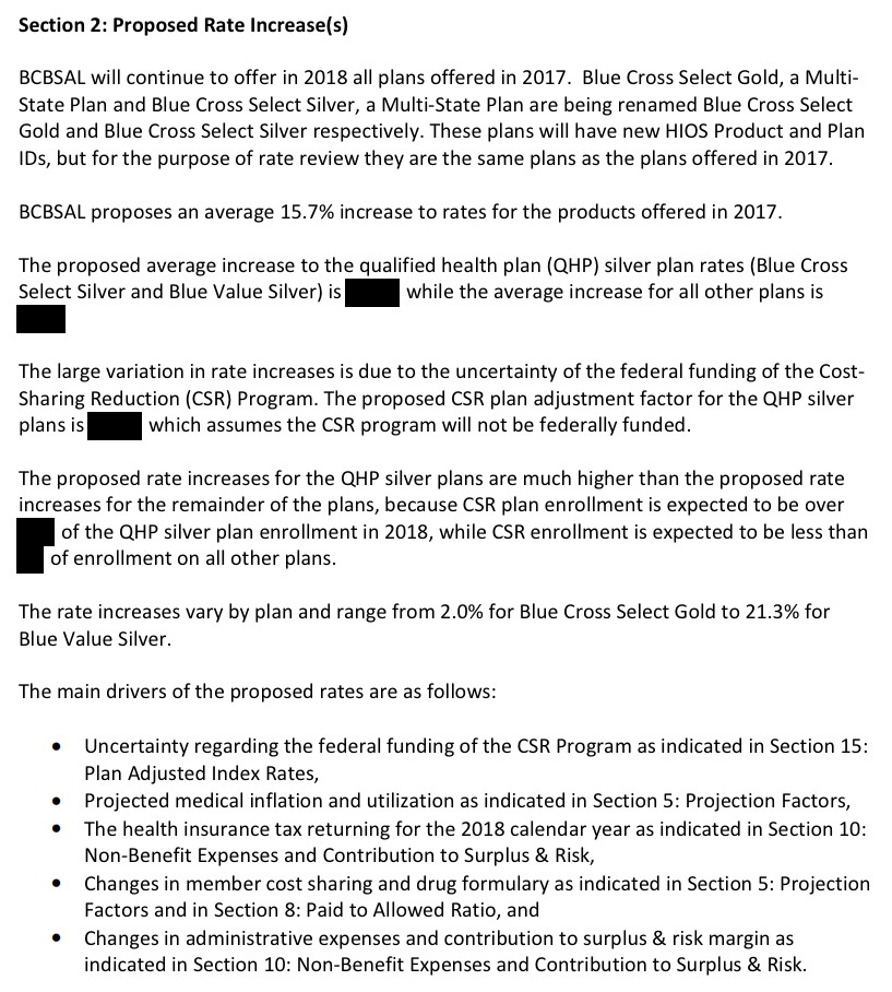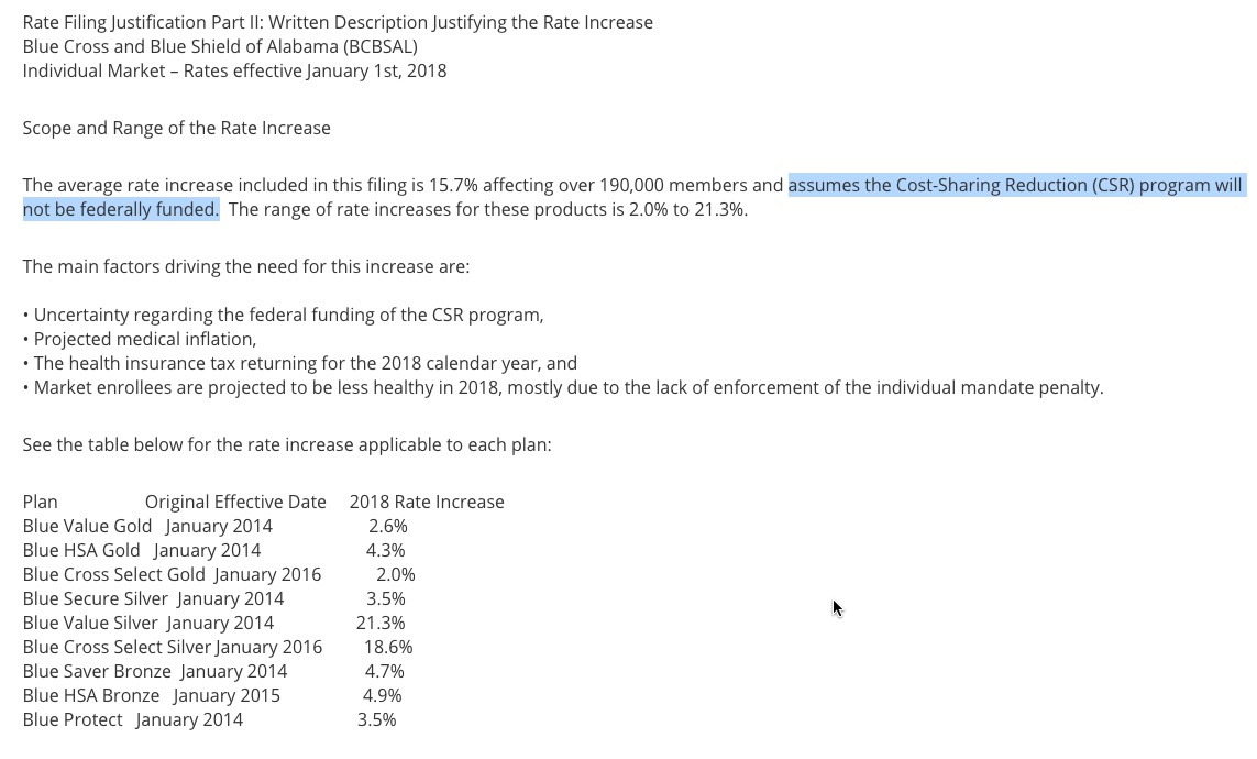 In the absence of any specifics about just how much the CSR issue is contributing, I'll again go back to the Kaiser Family Foundation estimates for each state, which suggest the rate hikes on Silver plans 25%, 11% and 14% lower respectively if CSR payments were guaranteed next year. In reality, as you can see below, BCBSAL is only asking for nominal 2.0 - 4.9% increases on all other plans...let's call it 3.5% for Alabama, a 30% reduction in Alaska and perhaps a 30% increase in Wyoming.