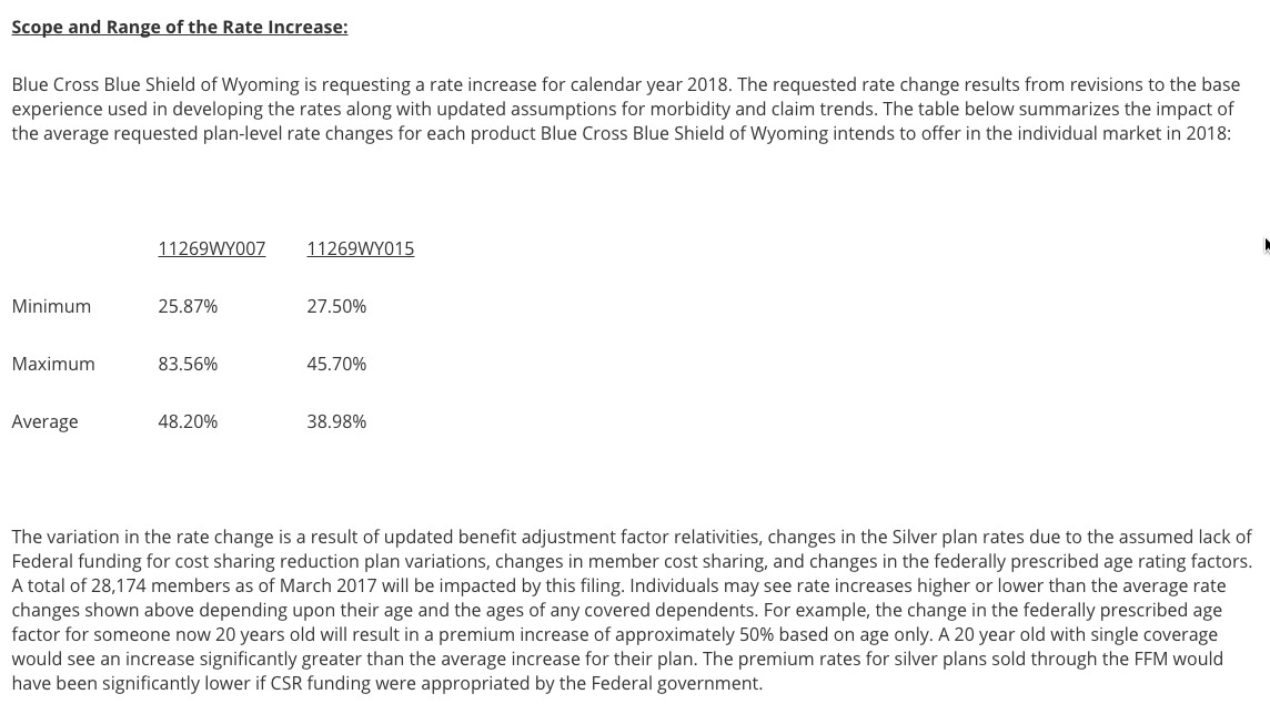 • WYOMING: BCBSWY is the only carrier, but they submitted two separate filings, one for their on-exchange plans and the other for their off-exchange/dental plans. Again, they explicitly call out the CSR issue as a major factor. BCBS of Wyoming has 28,174 enrollees total, around 21,000 of whom should be enrolled in on-exchange plans, so the breakout should be something close to: