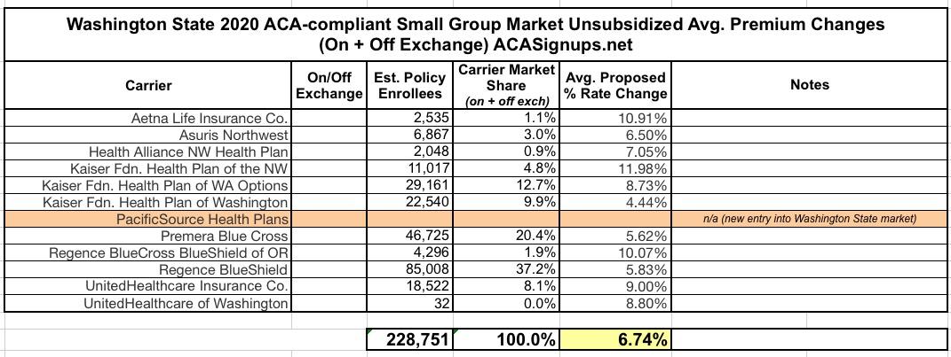 When I plug the hard numbers in from all of the insurers based on the rate filing summaries, I get a slightly higher weighted average of 1.43% instead of 0.96%, but that's pretty nominal and could be accounted for by several factors. Also, the grand total enrollment comes in at just 214,000 instead of the 248,000 noted in the press release; I'm not sure where the other 34,000 enrollees are...perhaps they're the last remnants of grandfathered plan enrollees? I did see one 2020 filing listing 6,300 enrollees in grandfathered LifeWise policies; it's possible that the other 28,000 or so are in grandfathered policies which aren't being renewed.