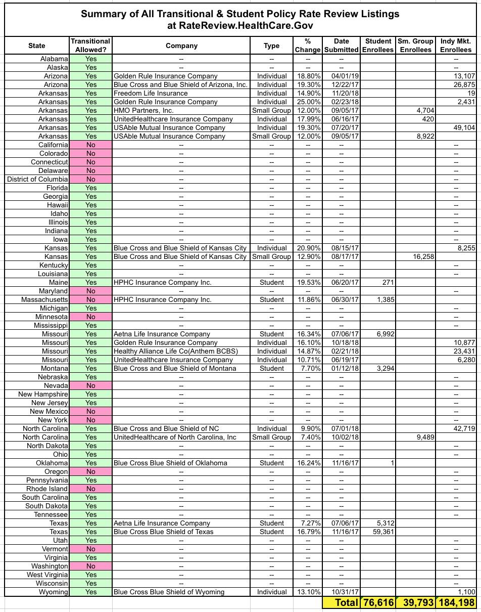 Yes, RateReview.HealthCare.Gov only includes Transitional or Student Plan rate filings in 11 states for a total of only 300,607 enrollees.