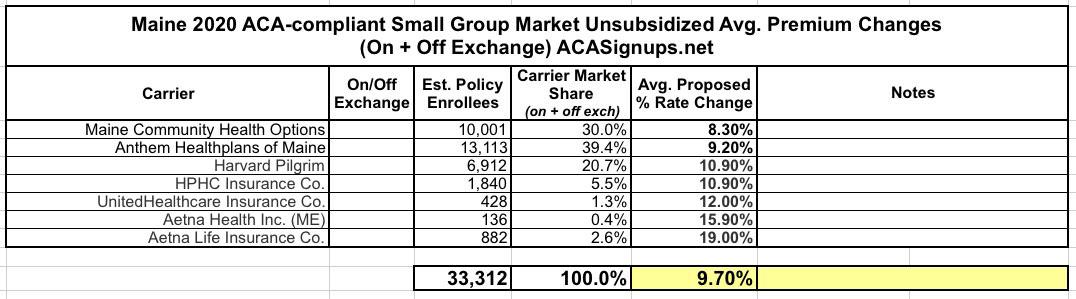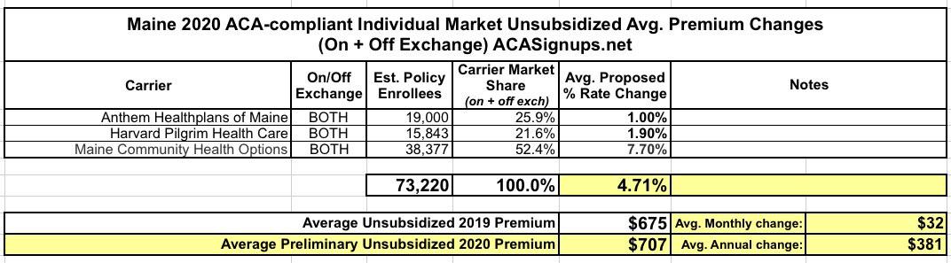 The state of Maine's Bureau of Professional & Financial Regulation has released their preliminary 2020 rate filings for the Individual and Small Group markets. Overall, the three carriers participating in their individual market are seeking a weighted average rate increase of 4.7% vs. last year. If approved as is, that would bring the average unsubsidized premium up from $675/month to $707/month, or around $381/year.