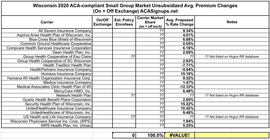 Unfortunately, the actual enrollment data for most of the carriers in Wisconsin is redacted, meaning I have no way of getting a total Individual Market size or the weighted average, although Gov. Evers already notes that it's a 3.2% reduction in his press release: