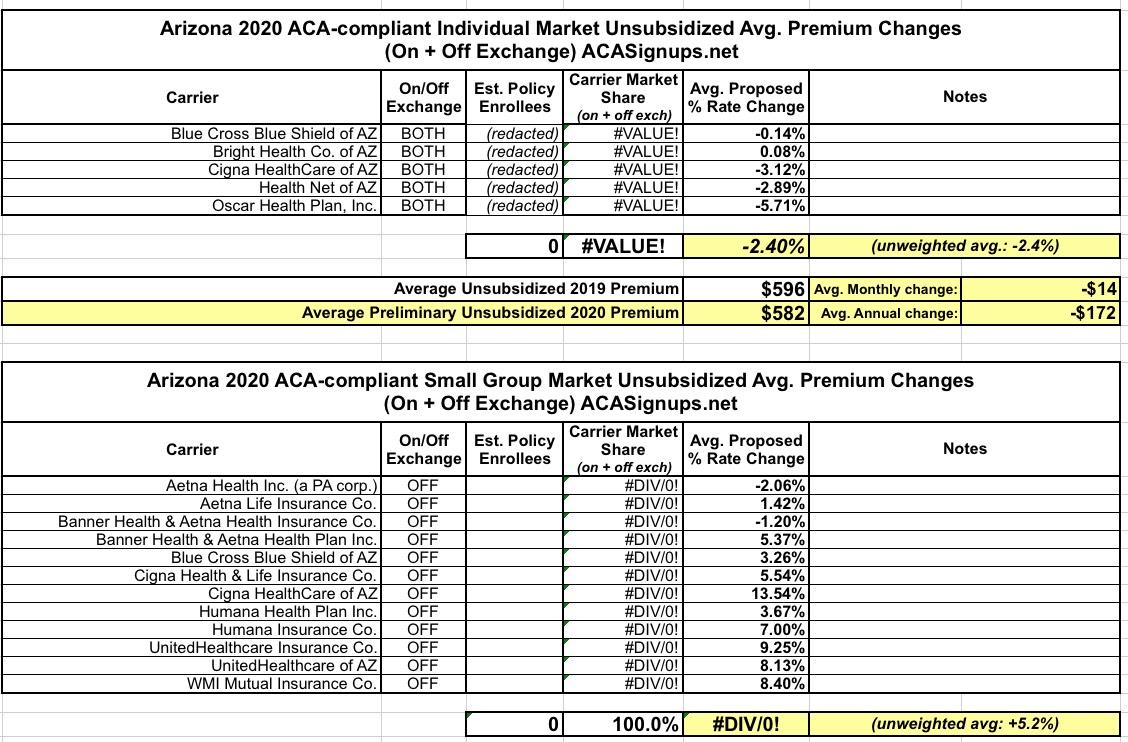 Arizona: *Preliminary* avg. 2020 #ACA premiums: 2.4% *decrease* (unweighted avg only)