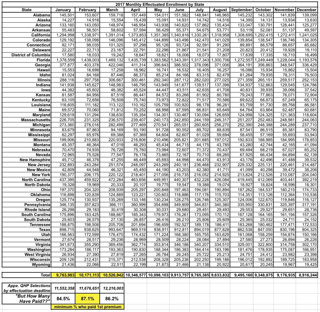 Therefore, the 2017 situation is a bit murky--of those enrolled by the end of December, at least 84.5% of them were paid in full for January coverage. Another 124,000 signed up by Jan. 15th in time for February coverage, pushing the payment rate up to 87.1%.