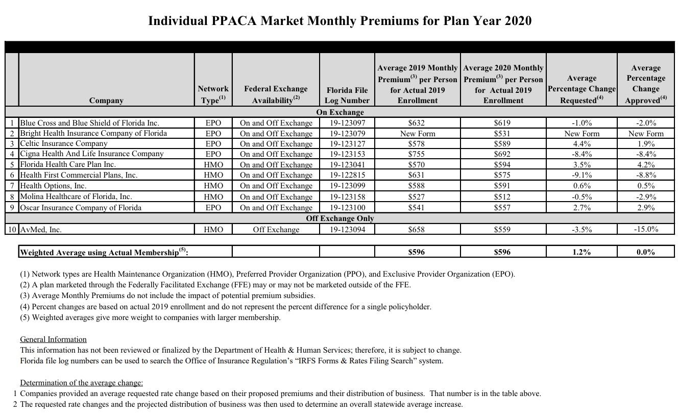 TALLAHASSEE, Fla. – The Florida Office of Insurance Regulation (OIR) announced today that premiums for Florida individual major medical plans in compliance with the federal Patient Protection & Affordable Care Act (PPACA) have been approved. Following OIR’s rate filing review, the average state-wide approved rate change on the Exchange is 0.0 percent beginning January 1, 2020.