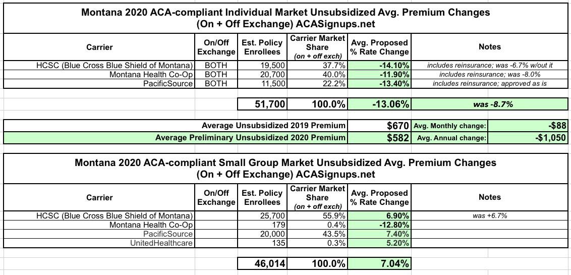 Montana: APPROVED 2020 ACA Exchange Premium Rate Changes: 13.1% *decrease* w/reinsurance waiver
