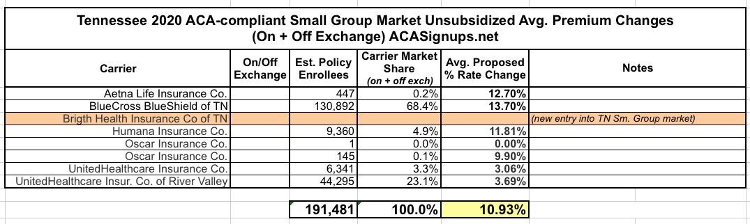 The press release doesn't say anything about approved rates for Tennessee's small group market, but here's the requested rate changes there: