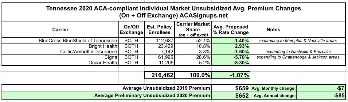 Tennessee: APPROVED avg. 2020 #ACA premiums: 1.1% DECREASE; 3 carriers expanding coverage