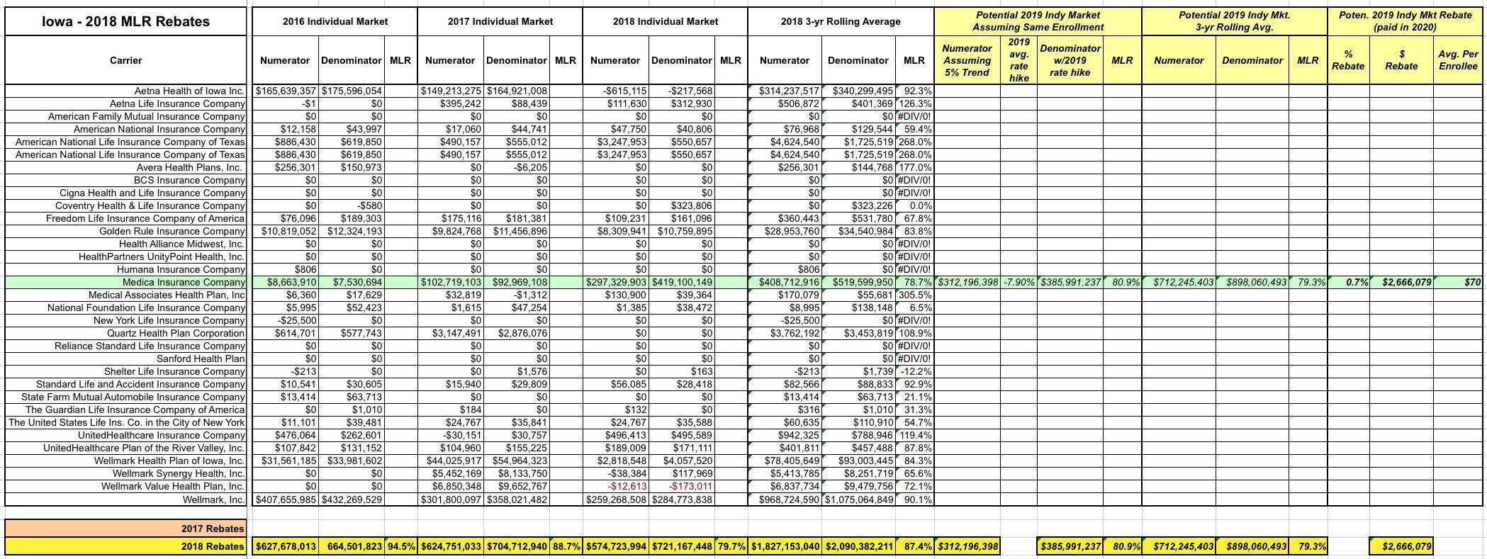 MLR rebate payments for 2018 are being sent out to enrollees even as I type this. The data for 2018 MLR rebates won't be officially posted for another month or so, but I've managed to acquire it early, and after a lot of number-crunching the data, I've recompiled it into an easy-to-read format.