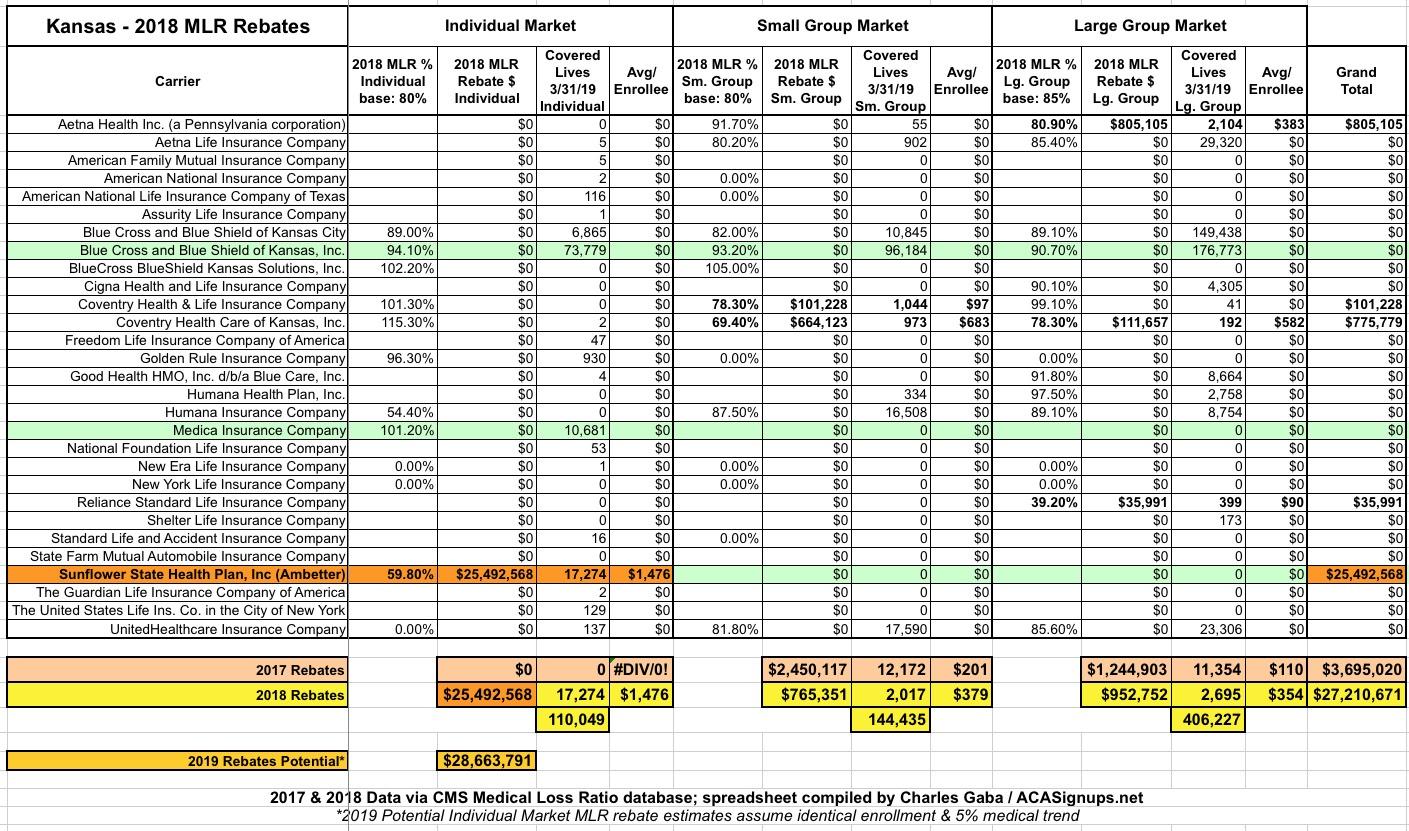 Kansas: If my data is accurate, 17,000 Sunflower State enrollees should be getting MLR rebate checks averaging $1,500 apiece!