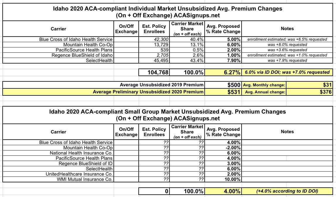 Not much to see here...in August, the Idaho Insurance Dept. posted their preliminary 2020 average rate changes for the individual & small group markets; they averaged 7.0% and 4.0% increases respectively. Today they've posted the final/approved rates, and the indy numbers have been whittled down ever so slightly: