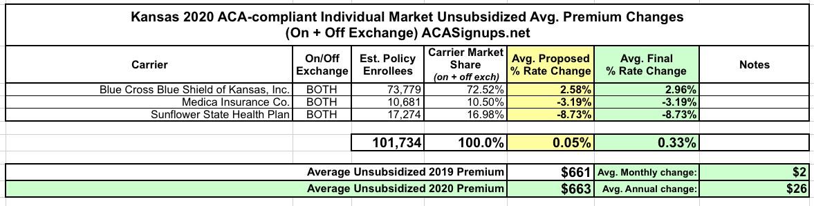 I didn't have the actual enrollment data for the individual carriers when I ran the numbers for Kansas in August, so I had to go with an unweighted average unsubsidized 2020 premium rate change. At the time, that came in at a 3.1% reduction.
