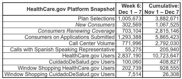 The Week 6 HealthCare.Gov Snapshot Report from CMS should be released sometime Wednesday afternoon, covering enrollment in 38 states from Dec. 1st - 7th.