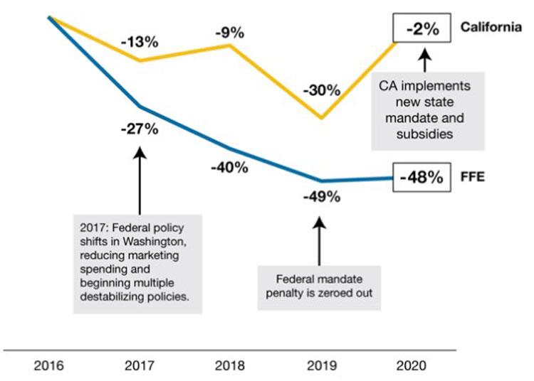 The actions and policies of California and of Covered California are in stark contrast to those seen at the federal level, which has maintained its significant cutbacks in marketing and outreach while encouraging consumers to enroll in substandard coverage in the 38 states served by the federally facilitated exchange (FFE). These policies have been demonstrated to directly contribute to far higher premium increases and lower new enrollment in states relying on the federal marketplace and dramatic drops in enrollment of unsubsidized consumers “off exchange” in those states.
