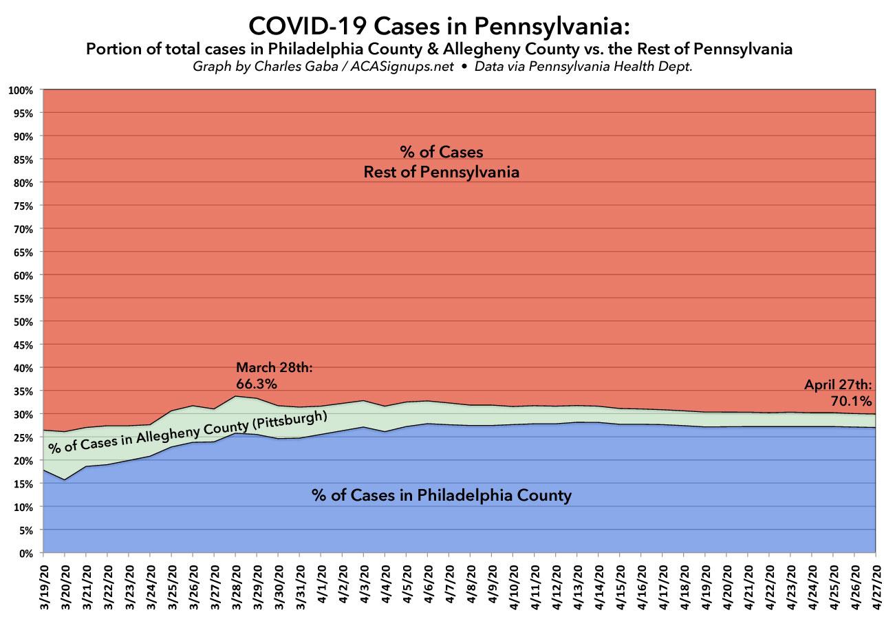 Unlike Michigan and Wisconsin, which started out with significantly higher COVID-19 rates in their urban centers but which have since seen a gradual but clear trend of the less densely-populated portions of the state increasing their share of cases, Pennsylvania seems to have stayed pretty steady for six weeks straight. The parts of the state outside of Philly and Allegheny have seen their share of total cases increase...but only by a few percentage points, rising from 66% exactly a month ago to 70% today.