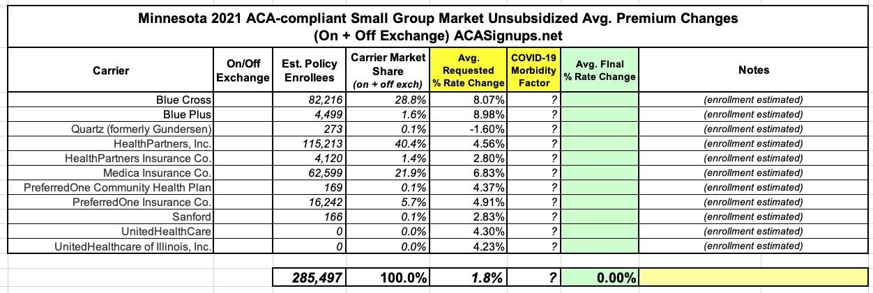 The good news out of Minnesota is that the Commerce Dept. has published the preliminary 2021 average rate changes for both the individual and small group markets in a simple table.