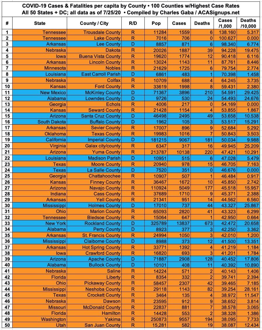 Here's the top 100 counties ranked by per capita COVID-19 cases as of Saturday, July 25th (click image for high-res version):