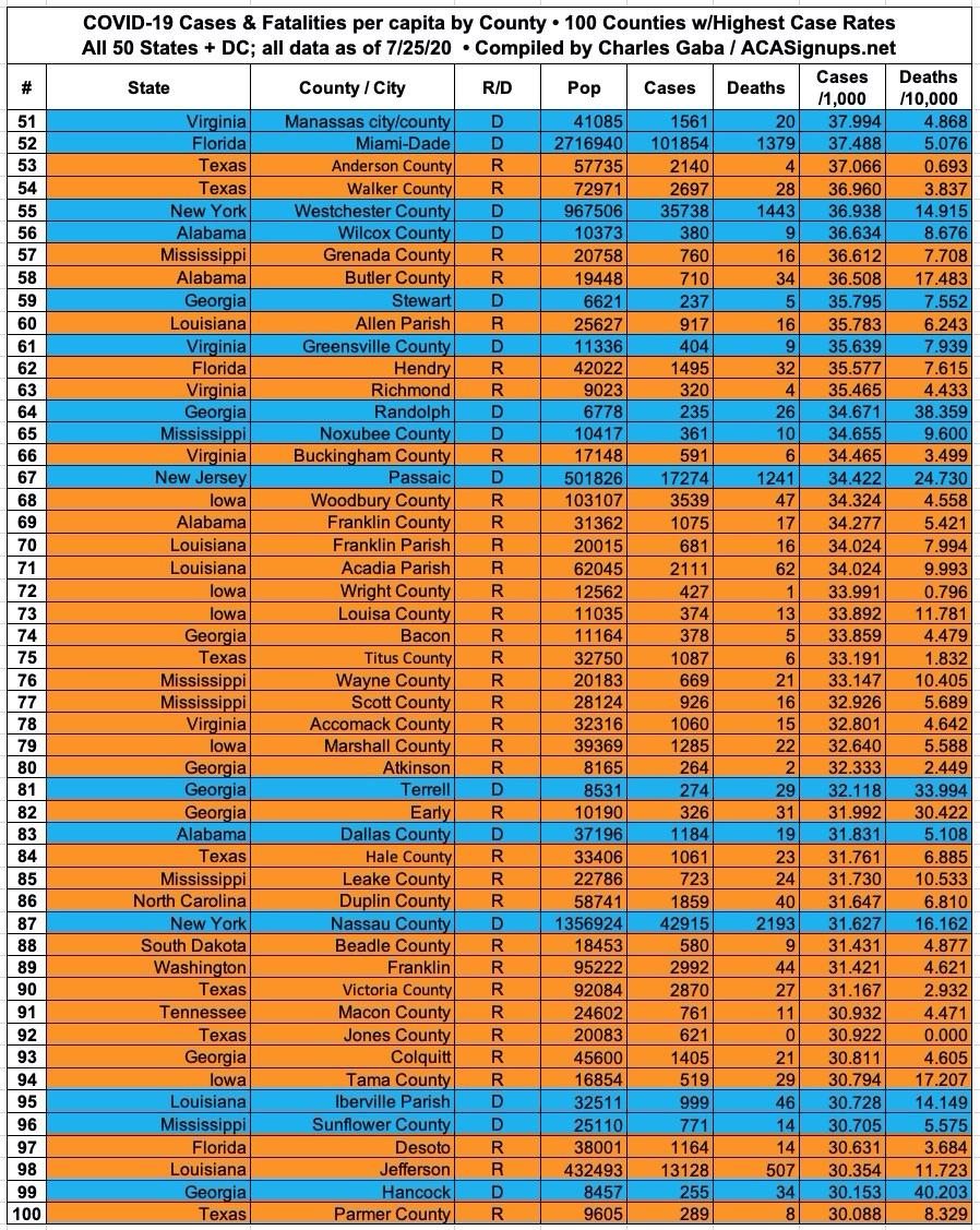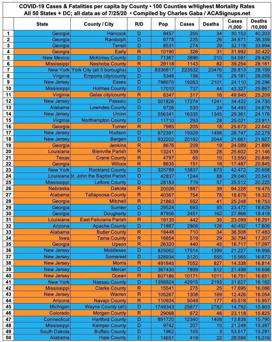 Here's the top 100 counties ranked by per capita COVID-19 fatalities as of Saturday, July 25th (click image for high-res version):