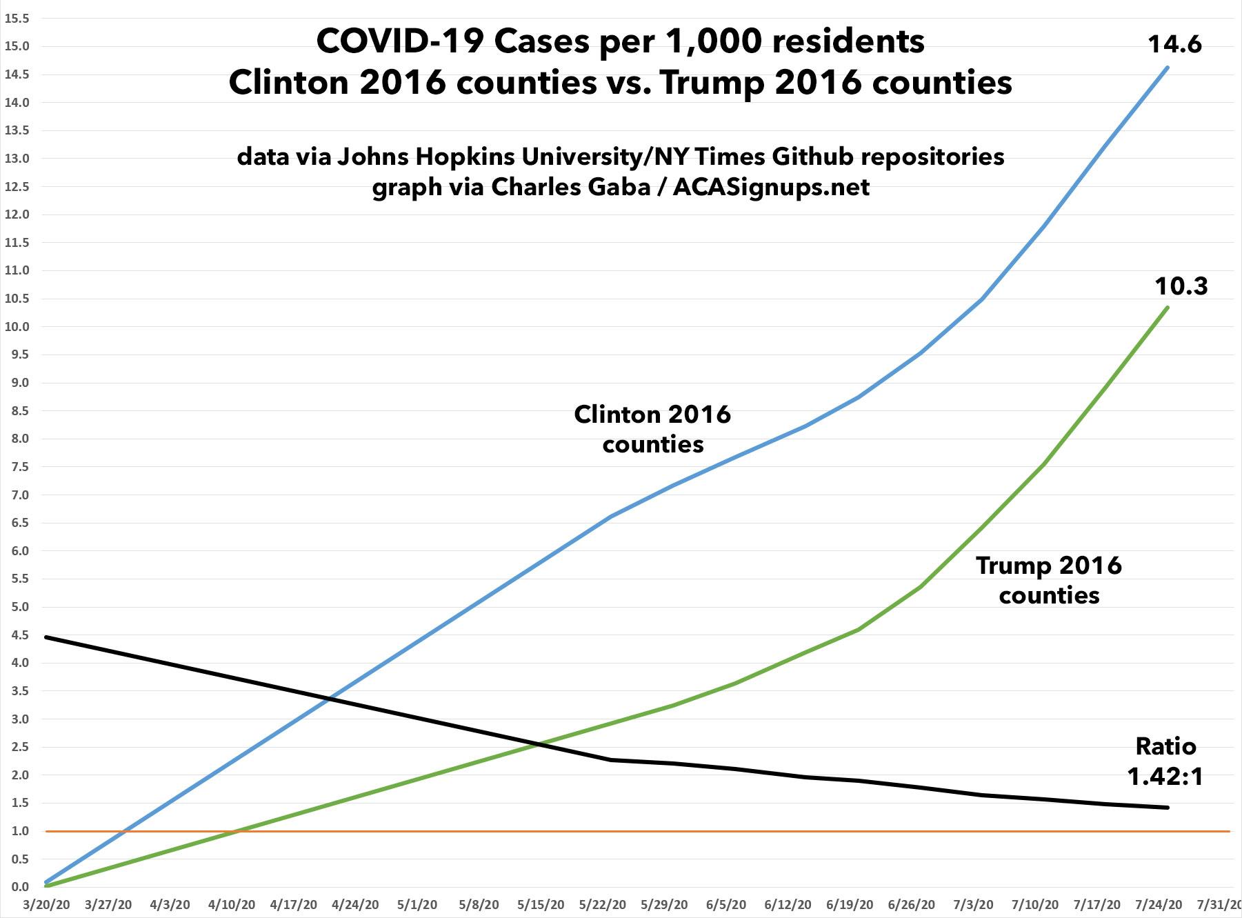 There's still clear disconnect between the counties with the highest rates of infection and the ones with the worst mortality rate. 70 of the 100 counties with the highest rate of infection voted for Donald Trump...and 22 of the other 30 are in states Trump won.