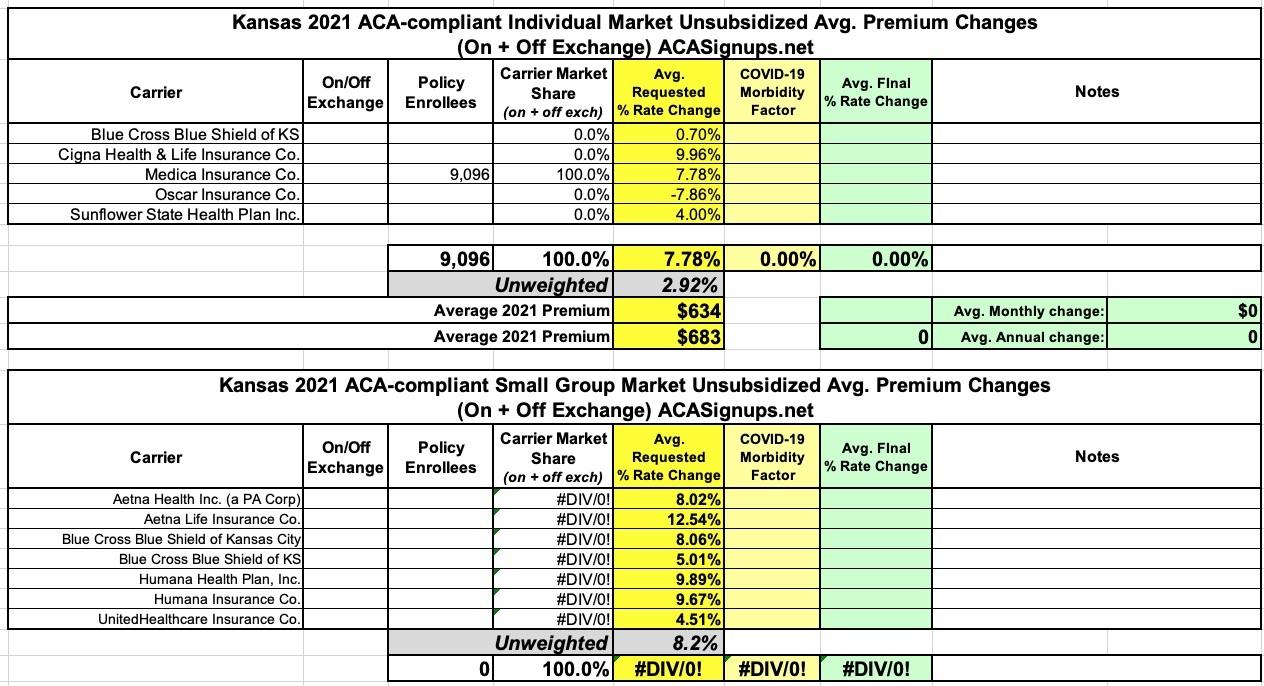 Once again, I'm afraid the actuarial memos for Kansas' 2021 individual and small group market carriers are either absent or redacted, so I have to run unweighted average rate changes, which are likely off significantly (for instance, the individual market is +7.8% unweighted, but if it turns out that, say, Oscar Insurance has 95% of the market share, the weighted average would be more like a 7% decrease).