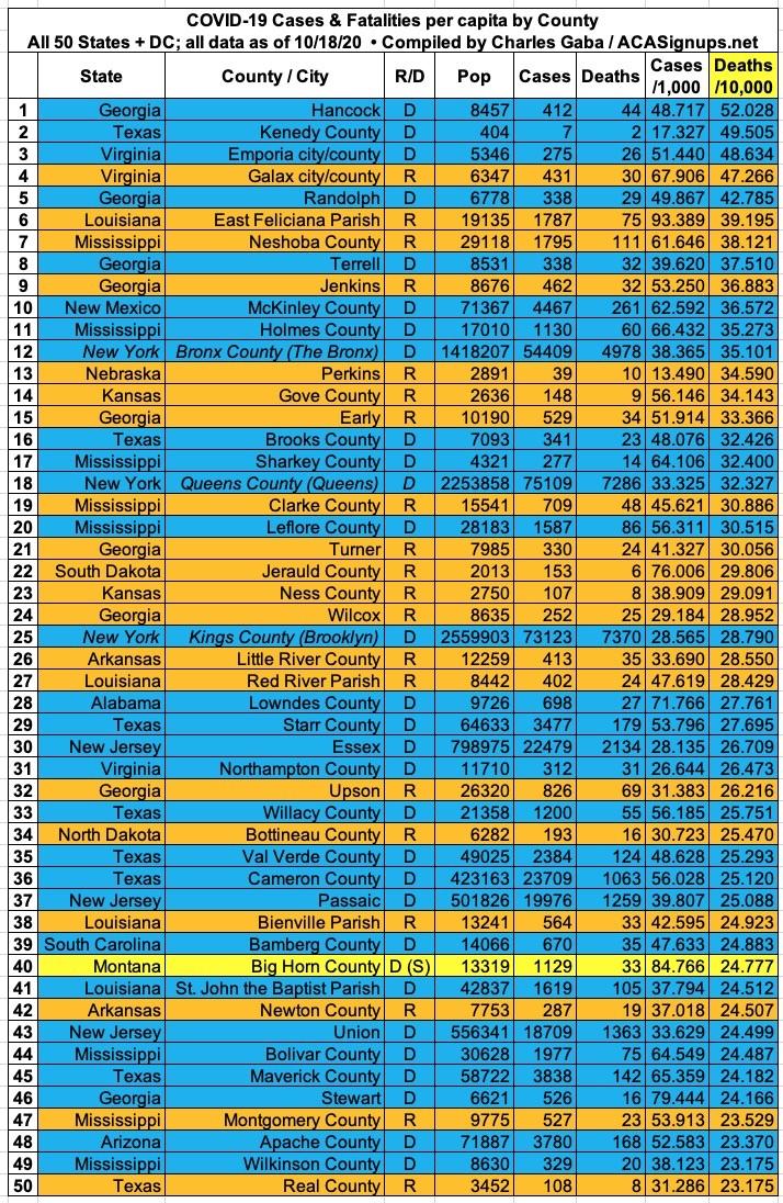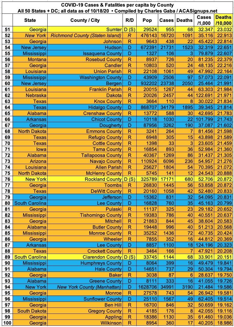 Here's the top 100 counties ranked by per capita COVID-19 fatalities as of Saturday, October 10th (click image for high-res version):