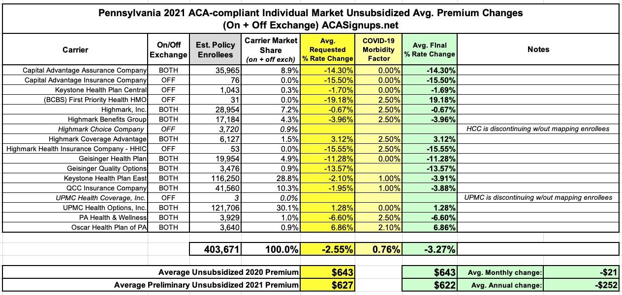 Pennsylvania: *Approved* avg. 2021 #ACA premiums: -3.3% indy market, +2.1% sm. group